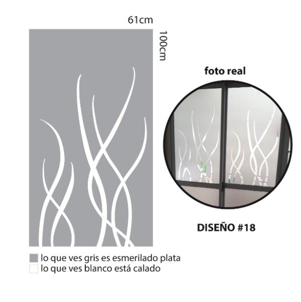 Una plancha de vinilo autoadhesivo esmerilado con Diseño calado. Tamaño de la plancha 100cm x 61cm.