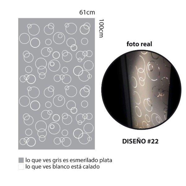 Una plancha de vinilo autoadhesivo esmerilado con Diseño calado. Tamaño de la plancha 100cm x 61cm.