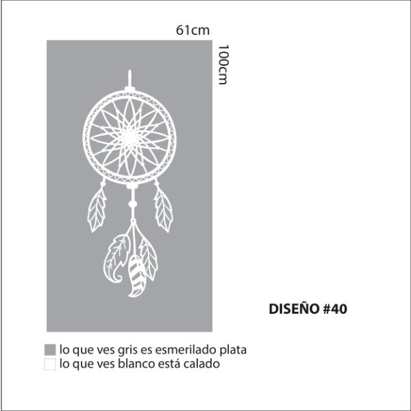Una plancha de vinilo autoadhesivo esmerilado con Diseño calado. Tamaño de la plancha 100cm x 61cm.
