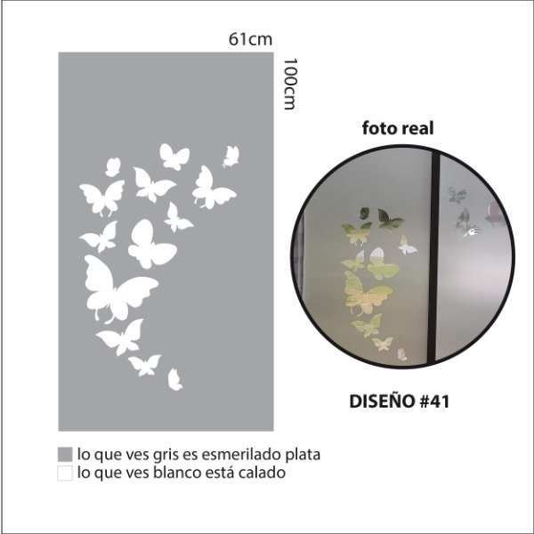 Una plancha de vinilo autoadhesivo esmerilado con Diseño calado. Tamaño de la plancha 100cm x 61cm.