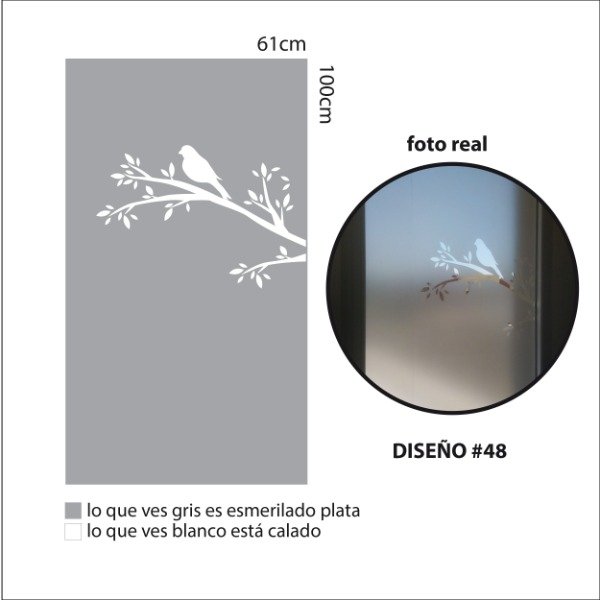 Una plancha de vinilo autoadhesivo esmerilado con Diseño calado. Tamaño de la plancha 100cm x 61cm.