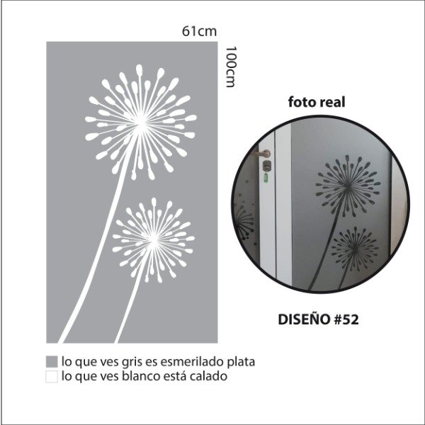 Una plancha de vinilo autoadhesivo esmerilado con Diseño calado. Tamaño de la plancha 100cm x 61cm.
