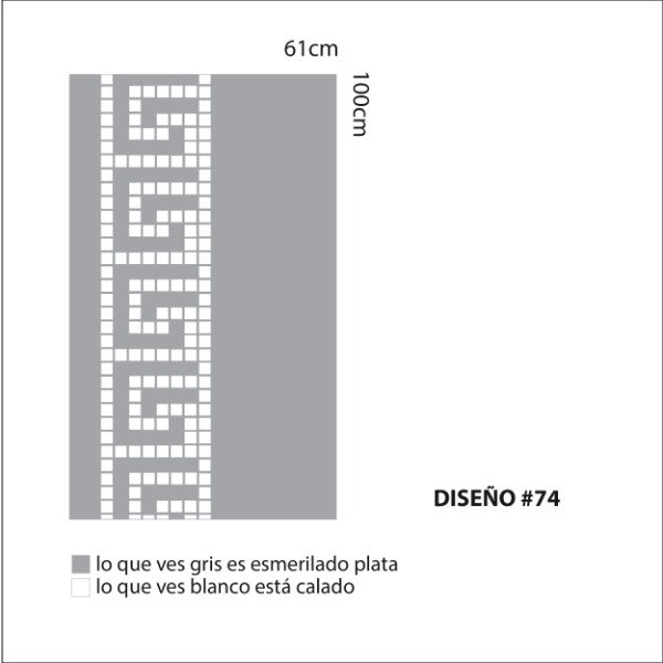 Una plancha de vinilo autoadhesivo esmerilado con Diseño calado. Tamaño de la plancha 100cm x 61cm.