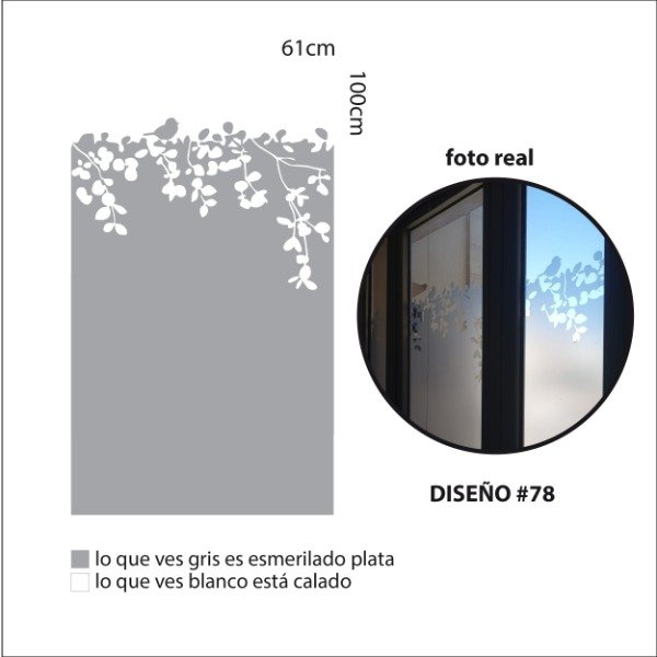 Una plancha de vinilo autoadhesivo esmerilado con Diseño calado. Tamaño de la plancha 100cm x 61cm.