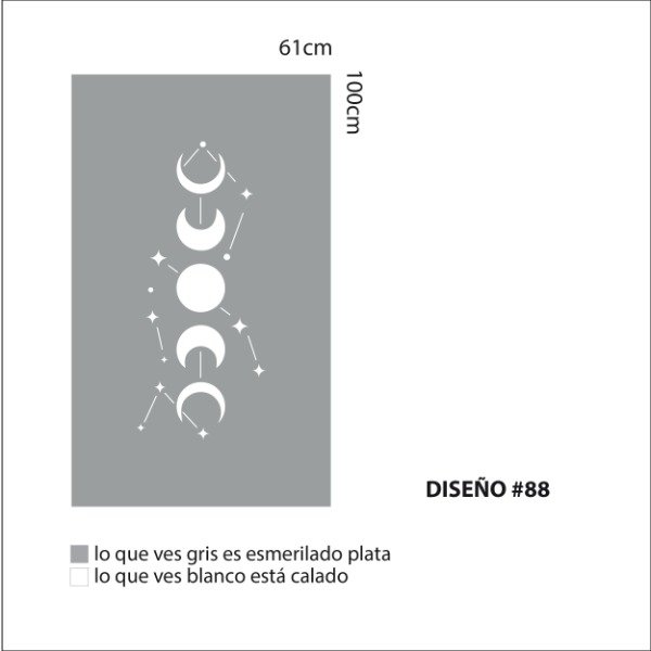 Una plancha de vinilo autoadhesivo esmerilado con Diseño calado. Tamaño de la plancha 100cm x 61cm.